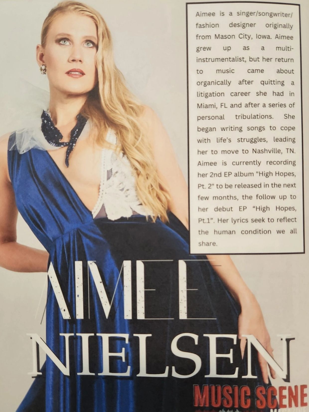 Aimee is featured in the July 2025 issue of Nashville Music Scene Magazine as an 'Artist to Watch'.